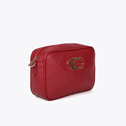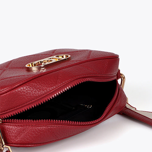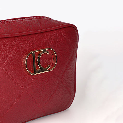 Bandolera efecto piel en color rojo de la marca Lola Casademunt. Diseño de monograma con rombos. Logo ovalado en la parte frontal en color dorado. Correa ajustable y extraíble logotipada. Incluye correa ajustable y extraíble efecto piel al tono. Cierre de cremallera y compartimento interior amplio para mayor capacidad.