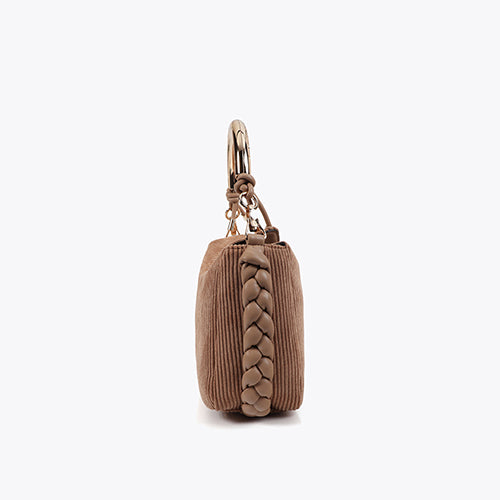 Bandolera efecto pana de la marca Lola Casademunto. Modelo aterciopelado en color camel. Asa metalizada personalizada y logotipo grabado. Incluye correa ajustable y detalles trenzados en los laterales al tono. Cierre magnético.