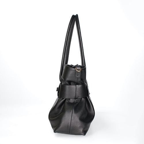 Bolso de hombro de la marca my-best bag. Fabricado en piel color negro. Detalle de tira alrededor del modelo con pieza tipo eslabón y tachas doradas. Doble asa de hombro. Incluye bandolera extraíble al tono. Cierre mediante botón clip. Forro interior textil. Bolsillo interior con cremallera. Detalle de marca en color dorado en la parte frontal.