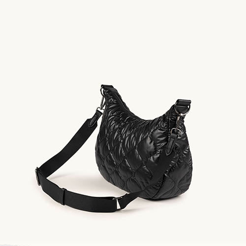 Bolso estilo bandolera de la marca Munich. Fabricado en un nylon de tacto suave y efecto semi brillo. Modelo de efecto acolchado en color negro. Cierre de cremallera en la parte superior. Asa bandolera regulable y extraíble para llevar cruzado o al hombro. Interior con bolsillo con cremallera.