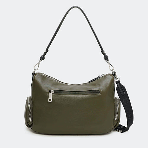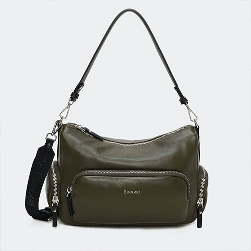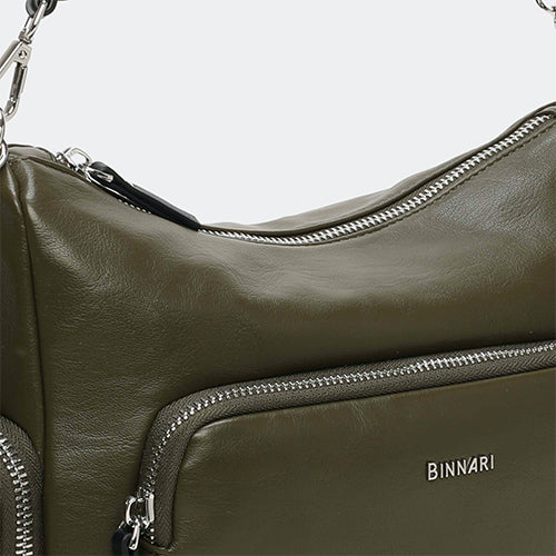Bolso bandolera de la marca Binnari. Confeccionado en pu soft y detalles en pu alta calidad, Modelo en color kaki. Cierre mediante cremallera. Incluye bolsillo en la parte delantera y posterior, ambos con cremallera. Así como, dos bolsillos pequeños laterales también con cremallera. Tiene 2 posiciones: bandolera y bolso de hombro gracias a su asa trenzada extraíble en color negro. Bandolera ajustable y extraíble. Detalle de marca en la parte frontal.
