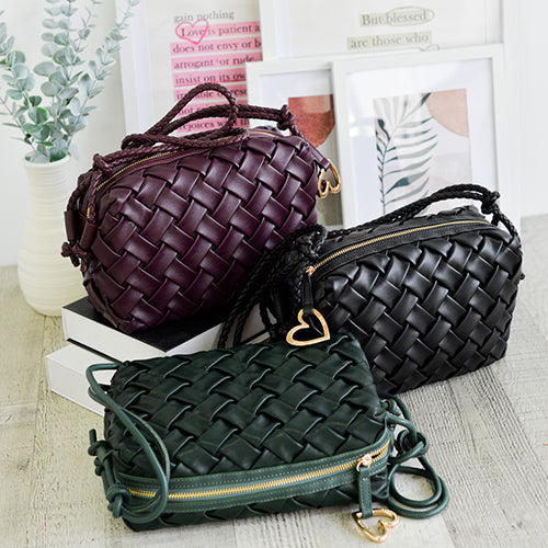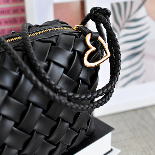 Bolso estilo bandolera de la marca Noco. Fabricada en piel vegana trenzada color negro. Cierre mediante cremallera en la parte superior. Bandolera ajustable para colgar en modo cordón trenzado al tono. Detalle de cierre con pieza metálica en forma de corazón en color dorado, símbolo de la marca.
