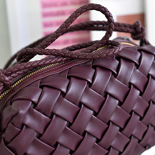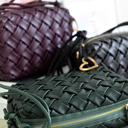Bolso estilo bandolera de la marca Noco. Fabricada en piel vegana trenzada color burdeos. Cierre mediante cremallera en la parte superior. Bandolera ajustable para colgar en modo cordón trenzado al tono. Detalle de cierre con pieza metálica en forma de corazón en color dorado, símbolo de la marca.