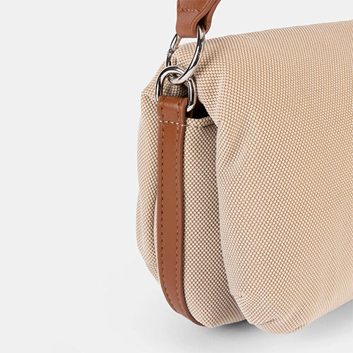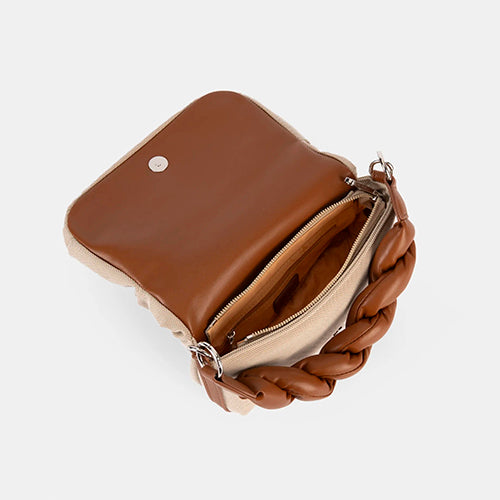 Bolso bandolera y de mano de la marca Pepe Moll. Fabricado en combinación de material textil y sintético en color camel. Adorno de original asa trenzada extraíble para llevarlo de mano. Cierre de solapa con imán y cremallera interior para mayor seguridad. Detalle de marca al tono en la parte frontal. Incluye bandolera ancha logotipada, ajustable y extraíble. Bolsillo con cremallera en la parte trasera del modelo. Diseño ligero y compacto, es ideal para quienes buscan un accesorio versátil que se adapte a cualquier ocasión, desde una salida casual hasta un evento especial.