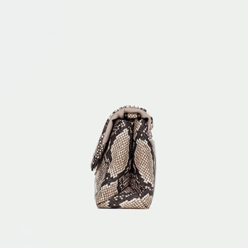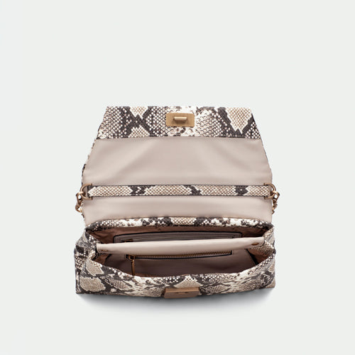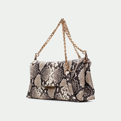 Bolso de hombro de la marca Hispanitas. Fabricado en material sintético efecto piel, estampado snake en tonalidades taupe. Bandolera tipo cadena extraíble. Cierre mediante solapa con clip automático. Detalle de logo en la parte frontal del modelo.