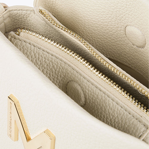 Bolso estilo bandolera de la marca Lola Casademunt. Fabricado en material efecto piel en color beige hielo. Detalle de asa acrílica multicolor extraíble. Contiene bandolera ajustable y extraíble efecto piel al tono. Compartimento interior con cremallera. Cierre imantado. Logo metalizado en frontal.
