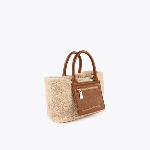 Bolso mini-shopper de la marca Lola Casademunt. Combinado con borreguito y detalles en color cuero efecto piel. Cierre con lengüeta y botón imantado. Asas de mano y bandolera ajustable y extraíble efecto piel. Bolso frontal con detalle de marca en color dorado. Forro de algodón y bolsillo interior con cremallera.