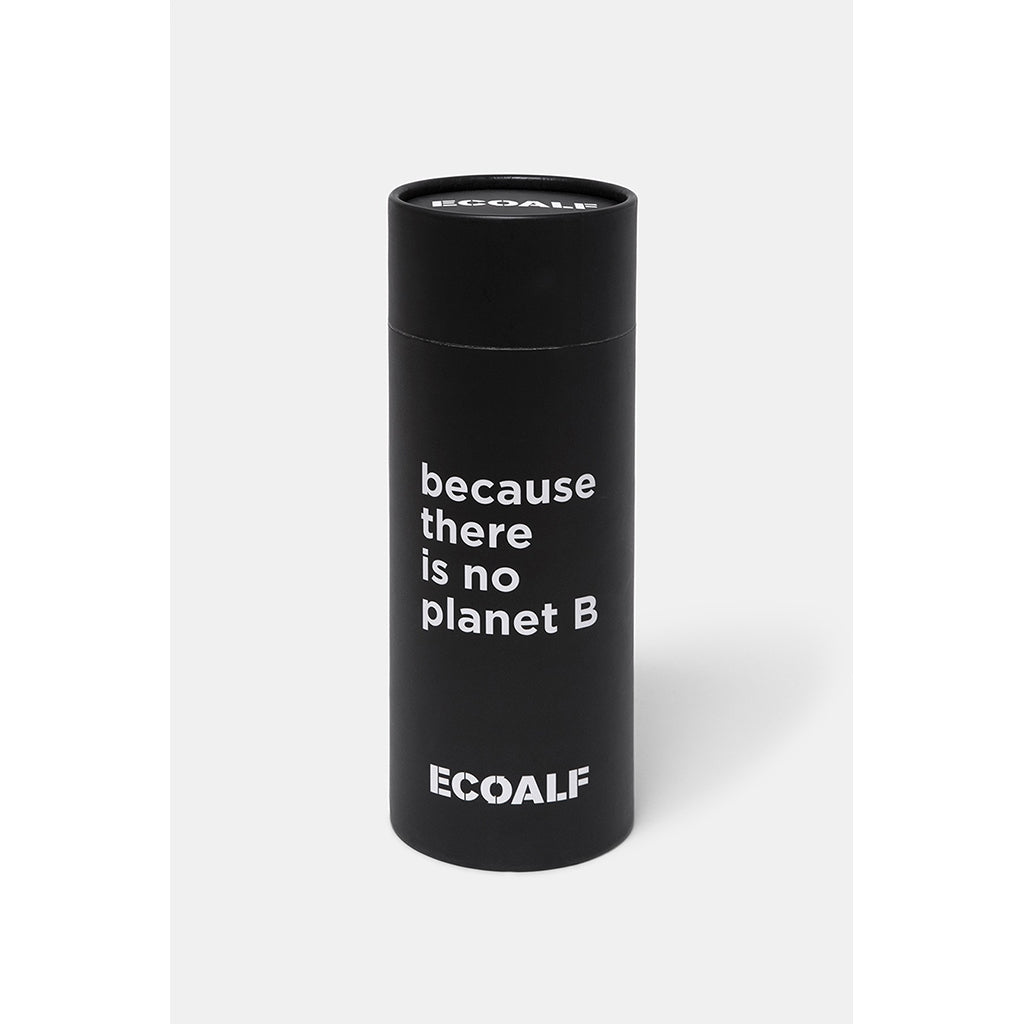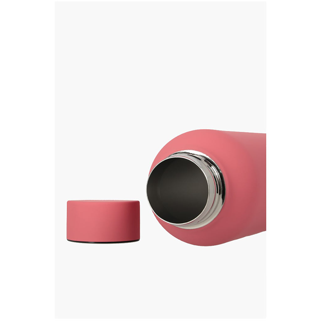 Botella de agua de la marca Ecoalf en color coral, con mensaje de texto "Because there is no Planet B". Fabricada en acero inoxidable de alta resistencia, con doble aislamiento al vacío, a prueba de fugas, no absorbe ni el olor ni el sabor.