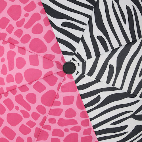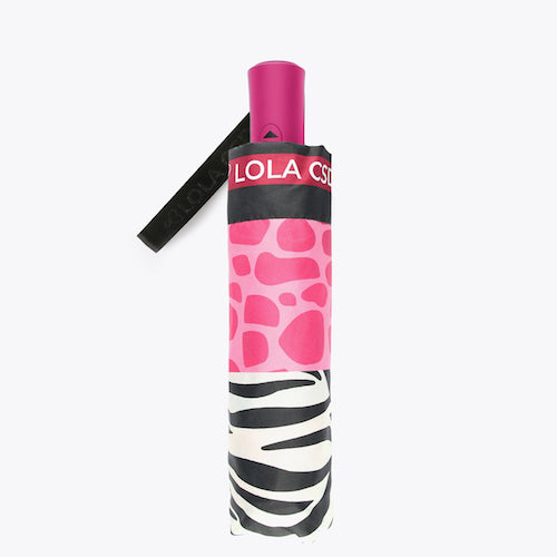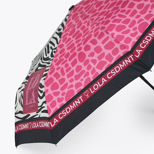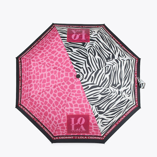 Paraguas de la marca Lola Casademunt. Diseño con estampados print combinado en colores rosa, blanco y negro. Apertura automática en 3 secciones y varillaje de aluminio. Funda protectora con el mismo estampado, mango a color y asa de mano.