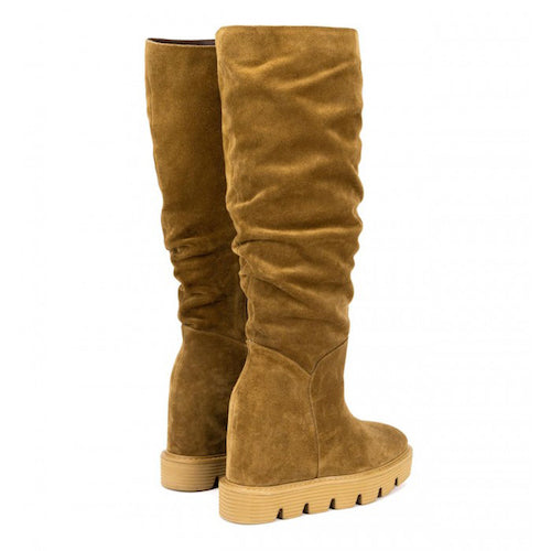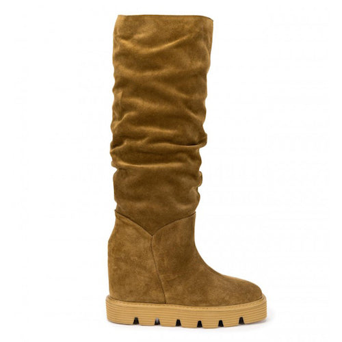 Bota alta con plataforma y cuña interna de la marca Alma Blue. Realizada en piel nobuk cuero. Cierre con cremallera en la parte lateral interior del modelo. Caña con efecto arrugado.
