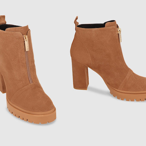 Botines de tacón alto y plataforma de la marca Lodi. Fabricado en piel serraje color camel. Cierre mediante cremallera sobre el empeine. Tacón bloque forrado al tono. Destaca tirador trasero al tono. Interior en piel. Incluye planta new gel para mayor comodidad en todas tus pisadas.