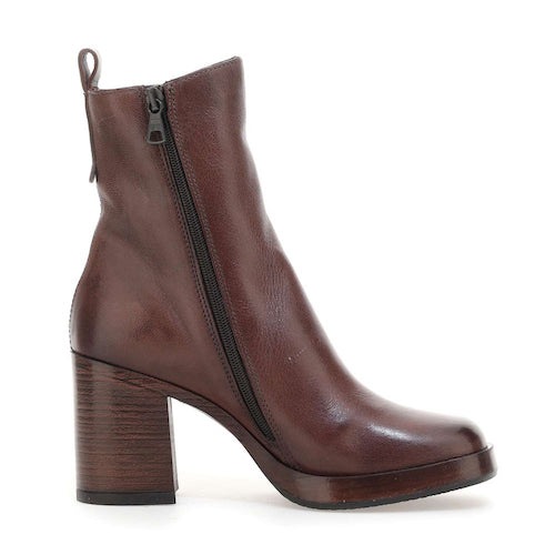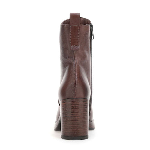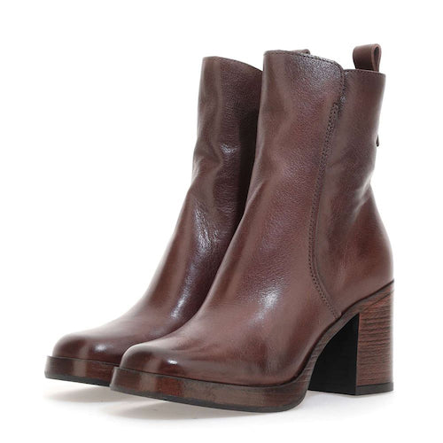 Botín de tacón alto de la marca itse. Fabricado en piel color cuero. Cierre mediante cremallera situada en la parte lateral interna. Modelo minimalista de caña media. Tacón bloque y suela de goma. Ligera plataforma que amortigua la pisada.