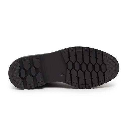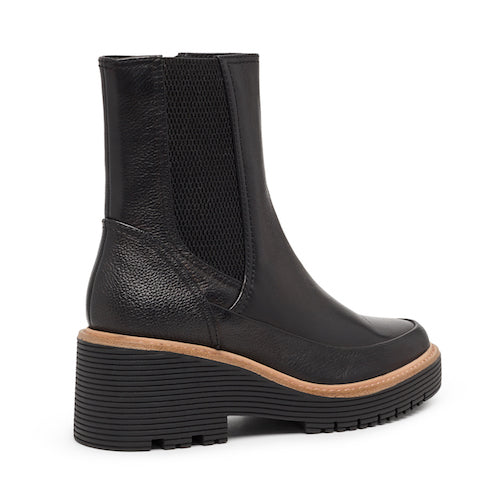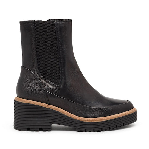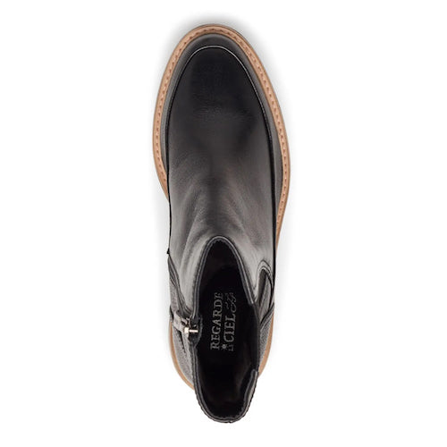 Botín con cuña de la marca Regarde Le Ciel. Fabricado en piel color negro. Forro interior en terciopelo. Panel lateral elástico. Cierre mediante cremallera en la parte lateral interior del modelo. Suela de goma. Plantilla de espuma de alta densidad y memory foam.