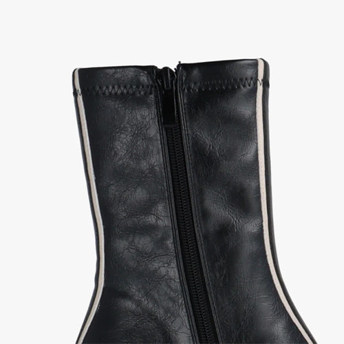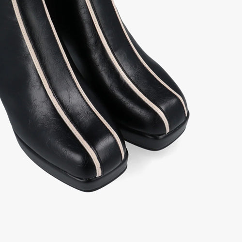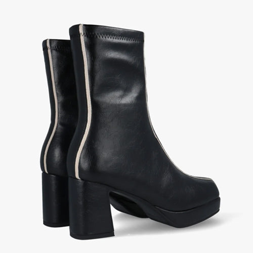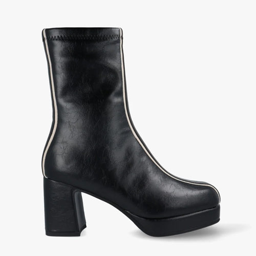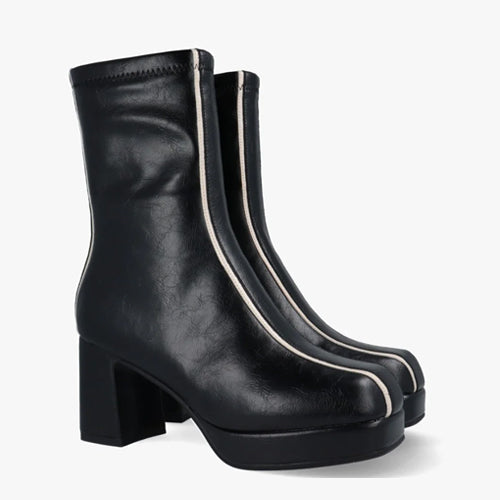 Botín con plataforma y tacón de la marca Noa Harmon. Modelo stretch fabricado en material napa color negro. Detalle de raya central en color blanco roto. Forro textil y plantilla de piel. Suela de goma.