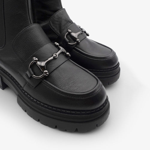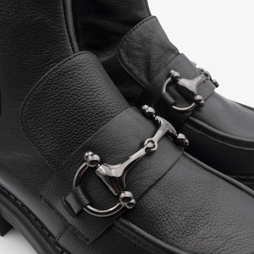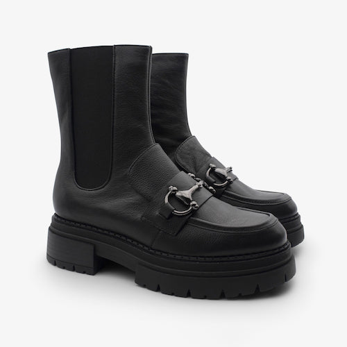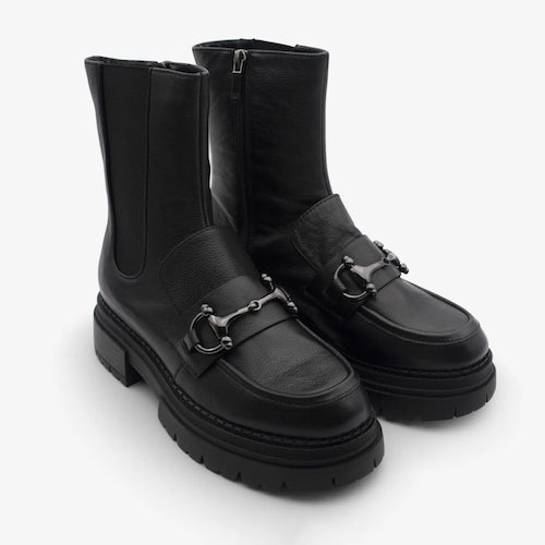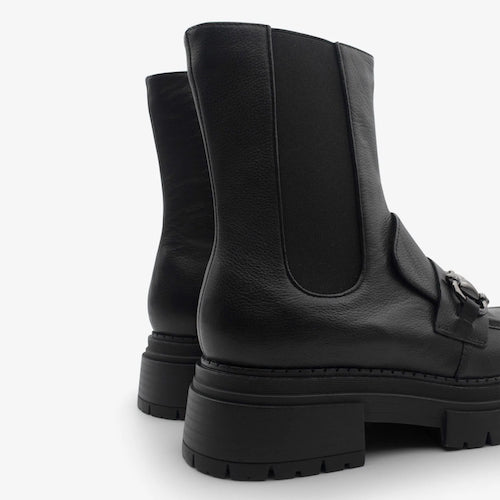 Botín estilo mocasín de la marca Regarde Le Ciel. Fabricado en piel color negro. Cierre mediante cremallera situada en la parte lateral interior del modelo. Detalle de hebilla en color plata oscura. Elástico al tono en la parte lateral exterior. Punta redondeada y suela de goma.