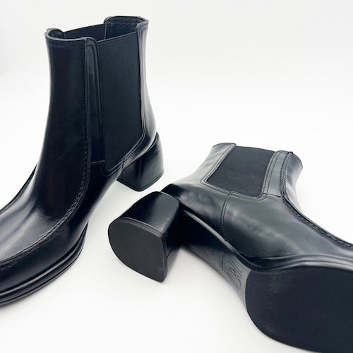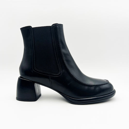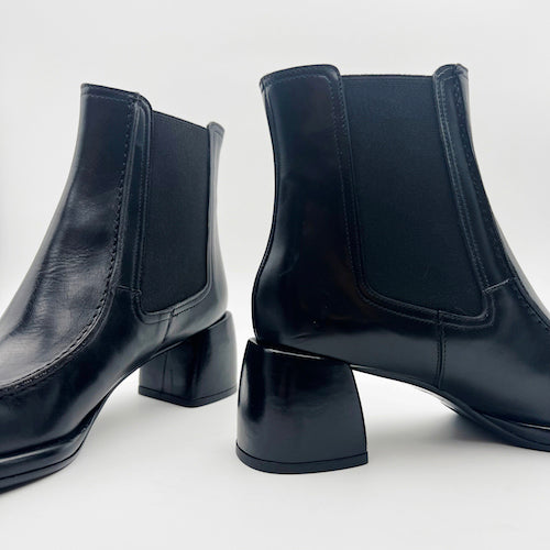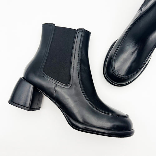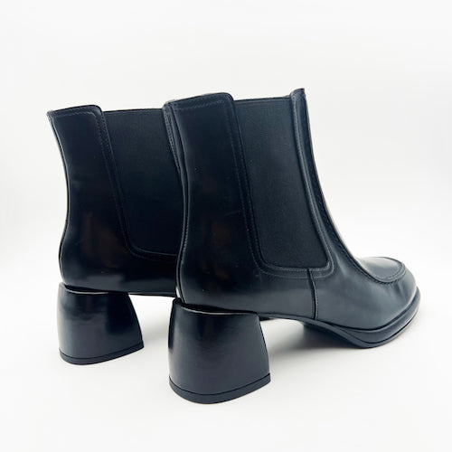 Botín de medio tacón de la marca Pons Quintana. Fabricado en piel color negro. Acabado en punta semi-cuadrada. Tacón bloque forrado en piel con forma redondeada. Modelo estilo chelsea con elásticos laterales al tono. Piso de goma antideslizante.