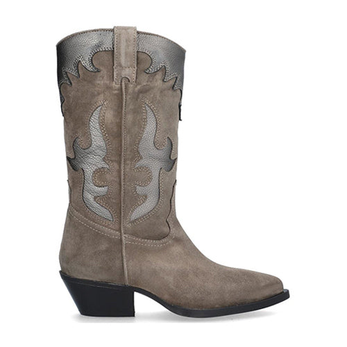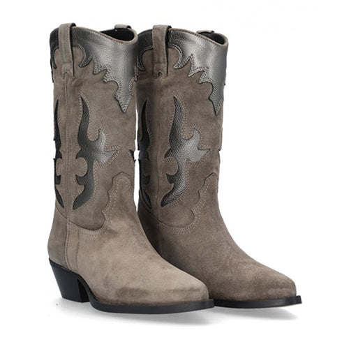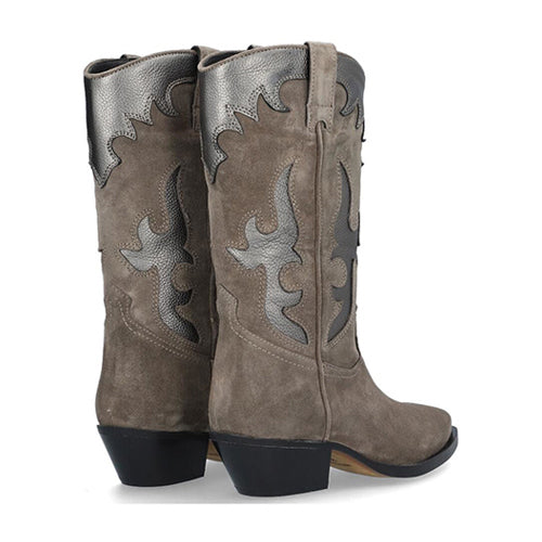 Bota estilo cowboy de la marca Alpe. Fabricada en piel nobuk en color piedra. Modelo de puntera afilada de caña media. Suela antideslizante.