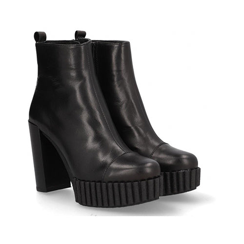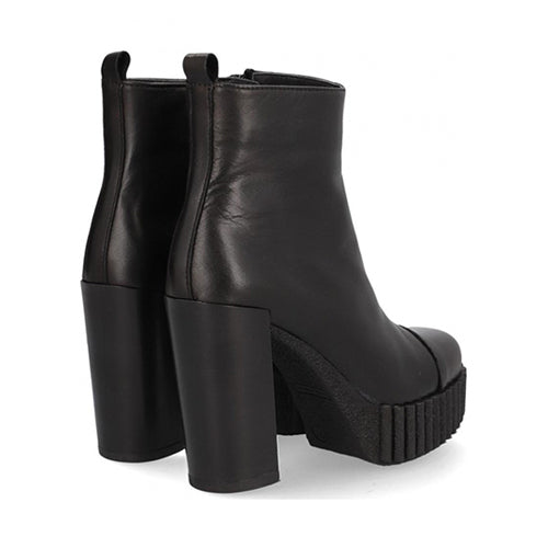 Botín de tacón alto y plataforma de la marca Alpe. Fabricado en piel color negro. Cierre mediante cremallera situada en la parte lateral interna. Modelo de caña baja y puntera redonda. Suela antideslizante.