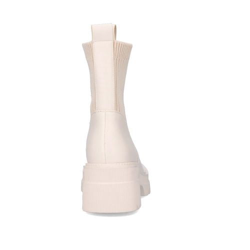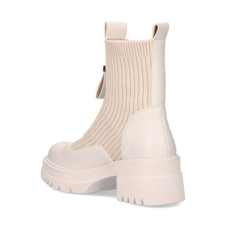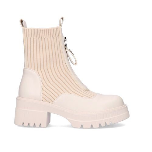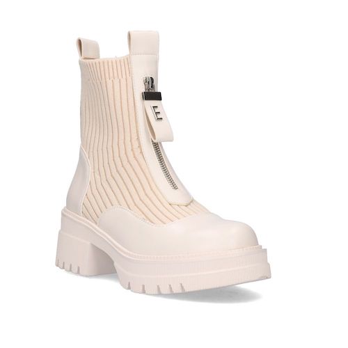 Botín estilo militar de la marca EXE en color beige. Modelo fabricado con piezas de corte combinado material textil drapeado y material sintético. Suela de goma con detalle de tiradores en la parte superior. Original cremallera a lo largo del empeine.