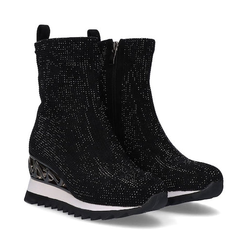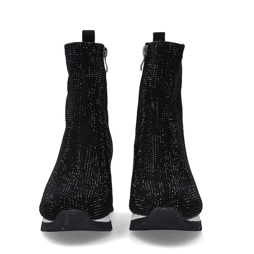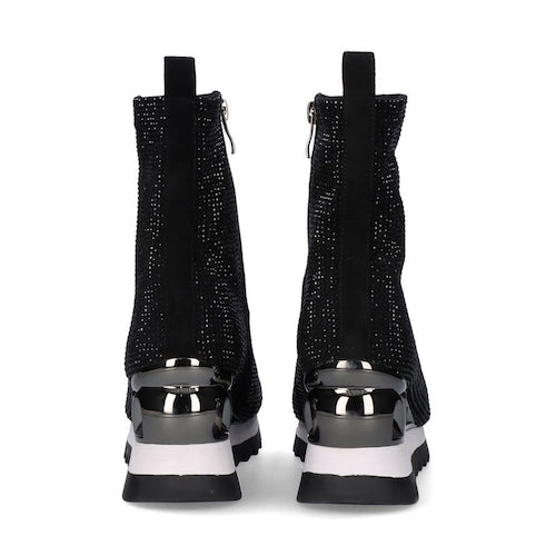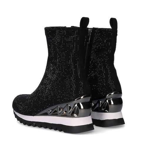 Botín con cuña de la marca EXE. Fabricados en material tipo licra forrada de piezas de strass en color negro. Corte y plantilla de material textil. Suela sintética. Cierre mediante cremallera situada en el lateral interior del modelo. Original cuña metálica.