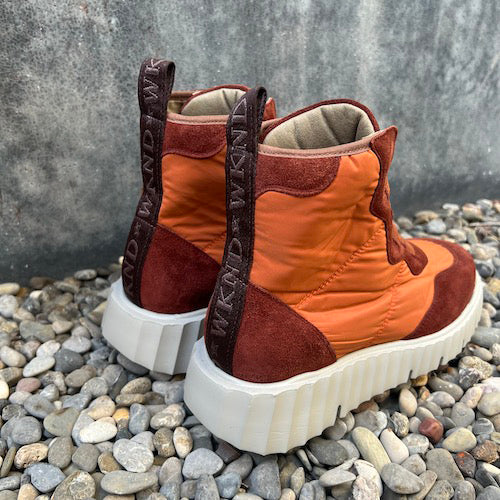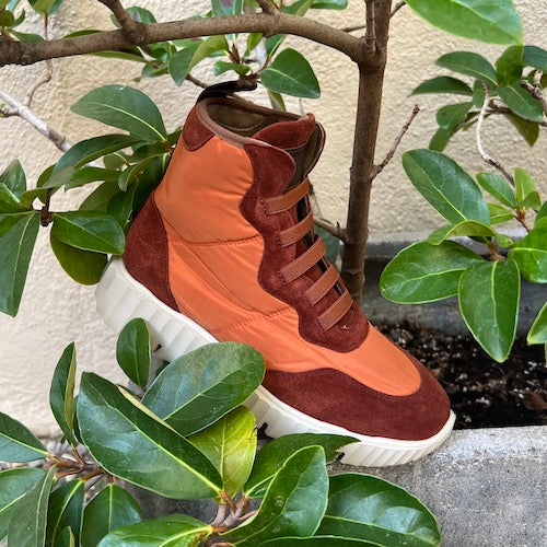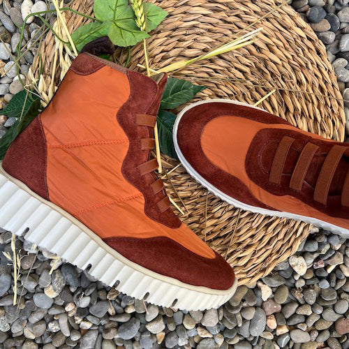 Botín casual de la marca Weekend by Pedro Miralles. Fabricado en combinación de piel serraje y tejido en color teja. Efecto acolchado. Elásticos al tono a lo largo del empeine, a modo de cordones. Detalle de marca en la parte posterior del modelo. Cuenta con plantilla extraíble. Suela de goma.