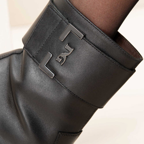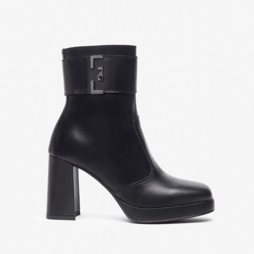 Botín de tacón alto y plataforma de la marca NeroGiardini. Fabricado en piel color negro. Detalle de fajín en piel al tono con logo en el lateral exterior. Cierre mediante cremallera situada en la parte lateral interior del modelo. Tacón ancho y cómodo. Suela de goma.