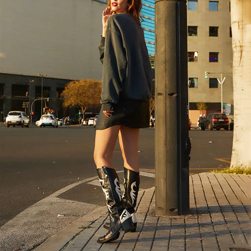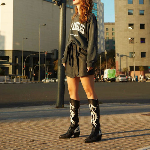 Bota campera de caña alta de la marca Nemonic. Fabricada en piel bicolor, combinando colores blanco y negro. Detalles en piel metalizada color bronce. Interior de la bota de piel de color cuero. Incluye cremallera en el lateral interior del modelo para un mejor calce. Suela de goma.