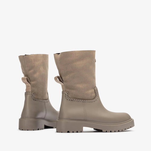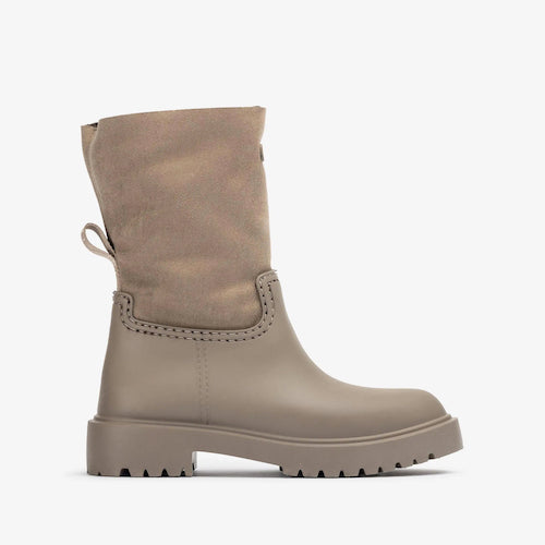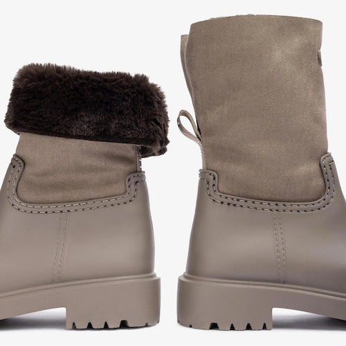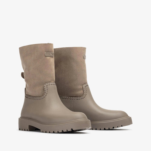 Botín de goma de la marca Unisa en color taupe. Modelo de caña con calcetín al tono forrado de pelo. Tiradores de nylon en la parte trasera. Planta interior extraíble y piso con tecnología SuperSoft que amortigua la pisada. Suela de goma EVA ultra-ligera.