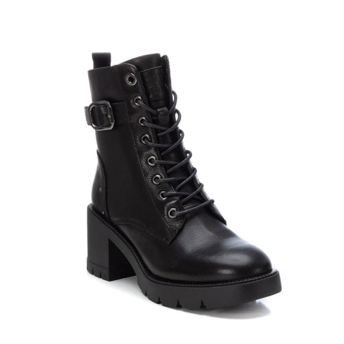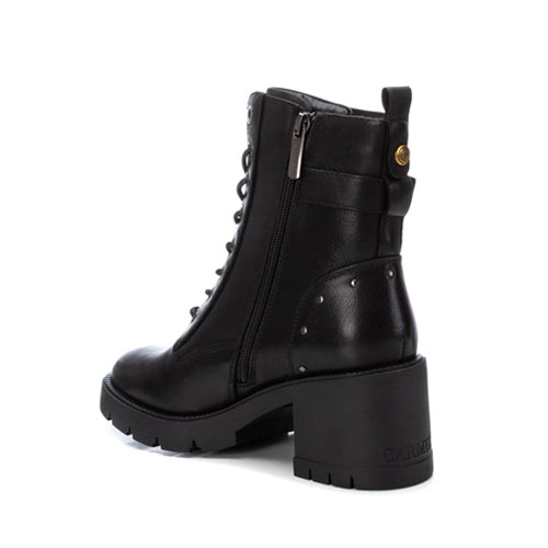 Botín de tacón de la marca Carmela. Fabricado en piel color negro. Cierre mediante cremallera en la parte lateral interior. Además, cuenta con cordones ajustables para un perfecto ajuste. Tirador trasero para facilitar el calce.Detalle de hebilla lateral y remaches metálicos en la parte posterior. Suela de goma gruesa y antideslizante.