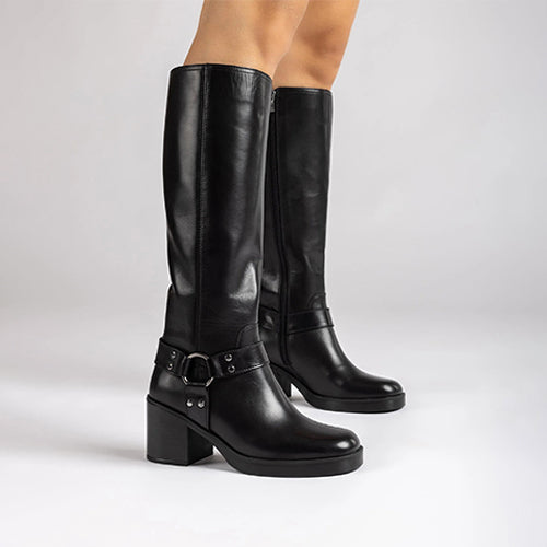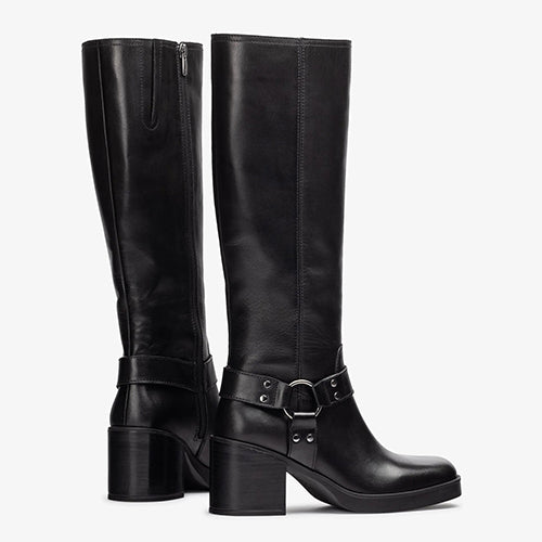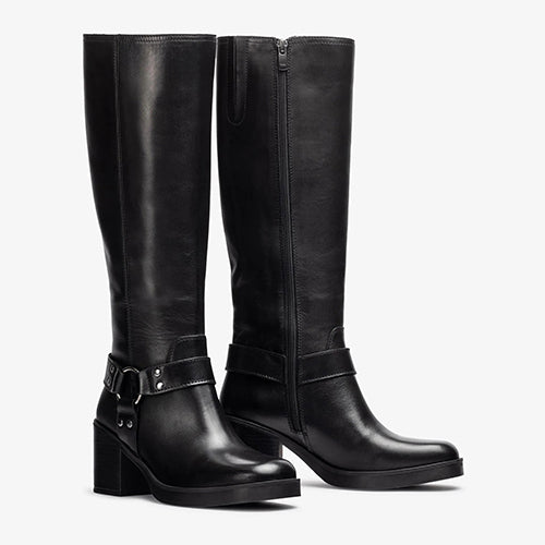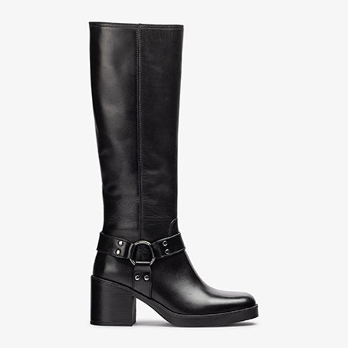 Bota de caña alta de la marca Unisa. Fabricada en piel color negro. Modelo estilo motero de puntera cuadrada. Cierre mediante cremallera situada en el lateral interior. Adorno de hebilla en la altura del tobillo. Tacón bloque efecto madera. Suela de goma ligera, flexible y antideslizante. Con tecnología Superlight que le aporta ligereza, confort, ergonomía y flexibilidad.