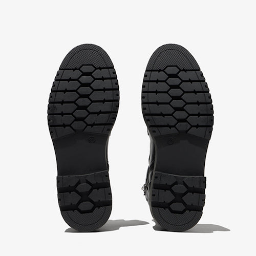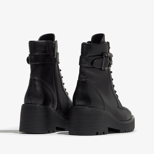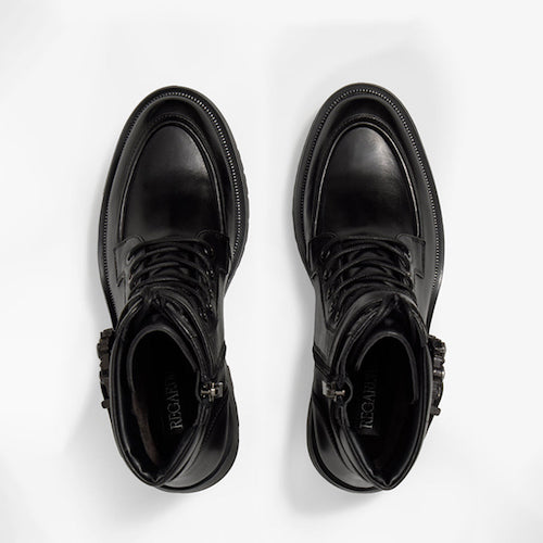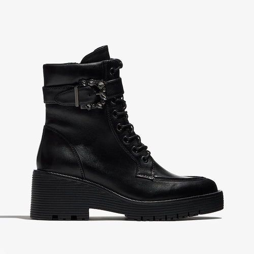 Botín estilo motero de la marca Regarde Le Ciel. Fabricado en piel color negro. Cierre mediante cordones y cremallera situada en la parte lateral interior para un perfecto ajuste. Detalle de ribete metálico en la suela y hebilla con pedrería en el lateral. Forro de terciopelo con pelo corto, garantizan calidez y suavidad a cada paso. Suela de goma.