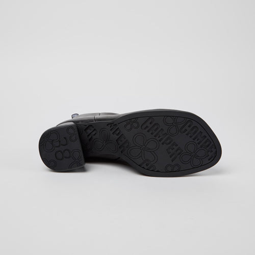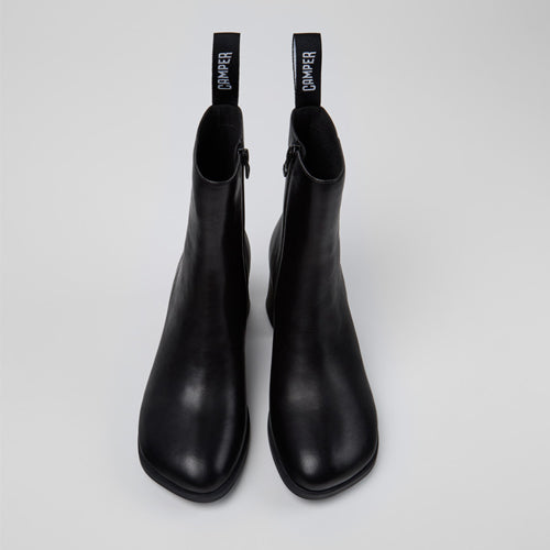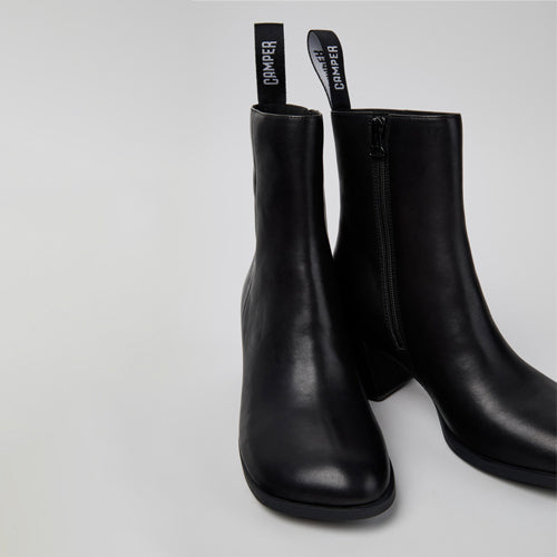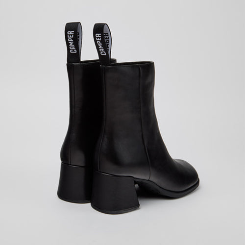 Botín de tacón medio de la marca Camper. Fabricado en piel color negro. Tacón forrado al tono. Cierre mediante cremallera situada en la parte lateral interior del modelo. Detalle de tirador con logo en la parte posterior para un mejor calce. Plantillas OrthoLite® Recycled™ y suelas de goma y ABS.
