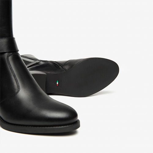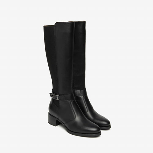 Bota de tacón bajo y caña alta de la marca Nero Giardini. Fabricada en piel y material técnico en color negro. Cierre mediante cremallera situada en la parte lateral interior. Detalle de hebilla metálica a la altura del tobillo. Interior en piel y textil. Tacón tipo bloque. Plantilla con tecnología DryGo!® absorbe la humedad y garantiza confort y bienestar. Suela de goma. Made in Italy.