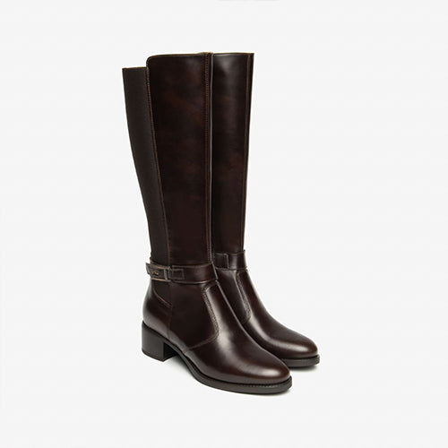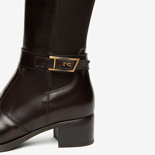 Bota de tacón bajo de la marca Nero Giardini. Fabricada en piel y material técnico en color marrón. Cierre mediante cremallera situada en la parte lateral interior. Detalle de hebilla metálica a la altura del tobillo. Interior en piel y textil. Tacón tipo bloque. Plantilla con tecnología DryGo!® absorbe la humedad y garantiza confort y bienestar. Suela de goma. Made in Italy.