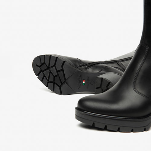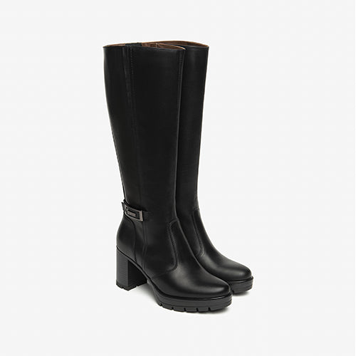 Bota de tacón y caña alta de la marca Nero Giardini. Fabricada en piel color negro. Cierre mediante cremallera en la parte lateral interna. Detalle de pieza metálica a la altura del tobillo. Modelo de puntera redondeada. Plataforma y tacón bloque. Suela de goma dentada.