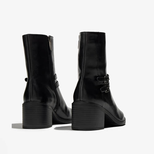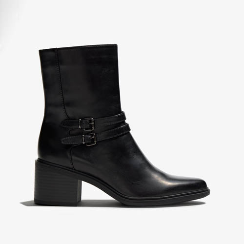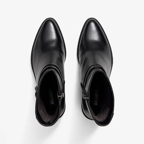 Botín de tacón medio de la marca Regarde Le Ciel. Fabricado en piel color negro. Parte superior lisa con costuras pronunciadas. Modelo atemporal de gran comodidad. Cierre mediante cremallera situada en el lateral interior. Detalle de dobles correas con hebillas metálicas. Tacón tipo bloque. Suela de goma.