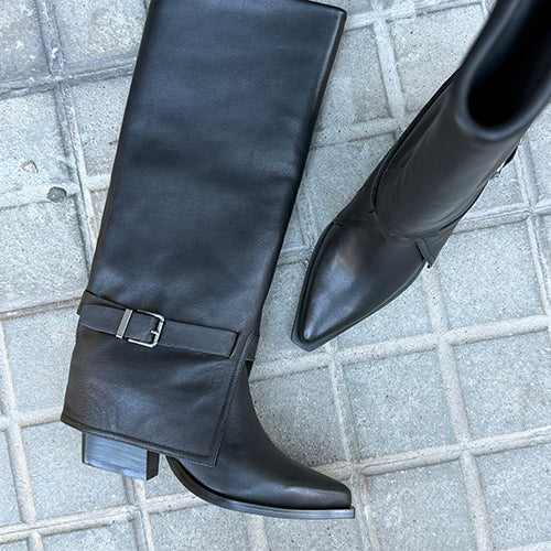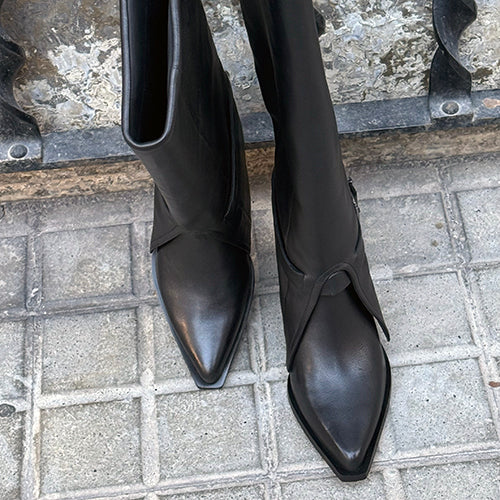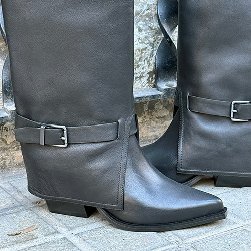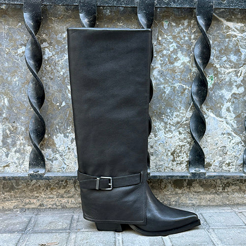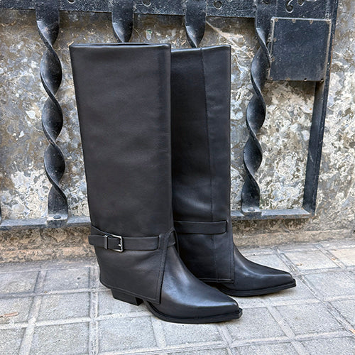 Bota de caña alta de la marca Bruno Premi. Fabricada en piel color negro. Modelo con faldón de puntera afilada. Detalle de tira con hebilla metálica. Plantilla confort y forro de piel. Suela de goma.