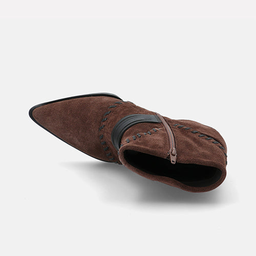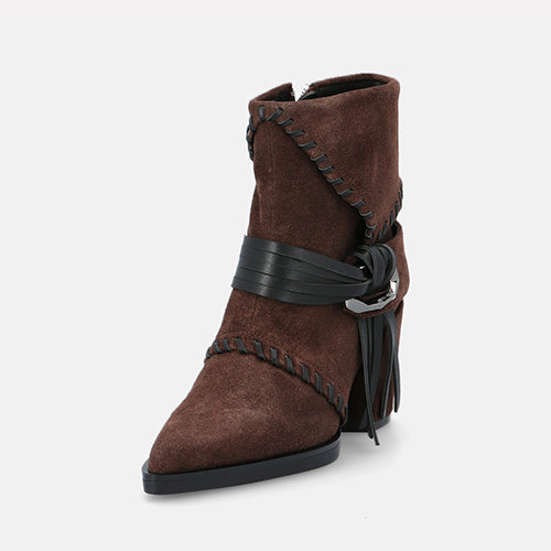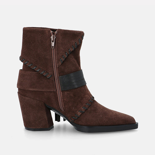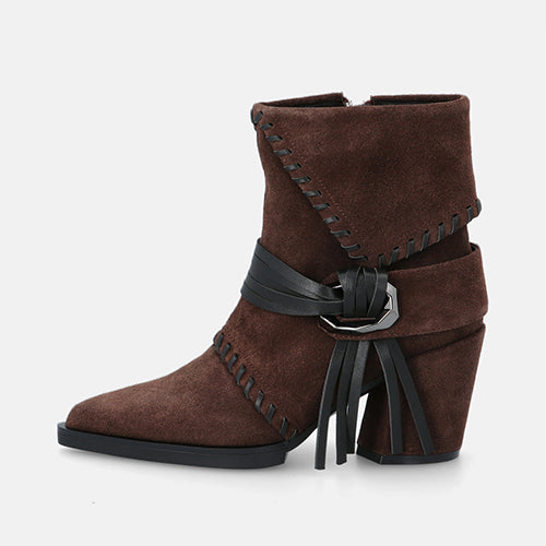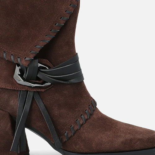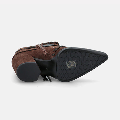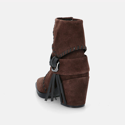 Botín de tacón alto de la marca Elvio Zanon. Fabricados en suave piel de ante en color marrón. Detalle de costuras decorativas tono sobre tono y una banda con flecos y hebilla geométrica que rodea el tobillo. Tacón ancho forrado al tono, muy estable y cómodo. Plantilla memory foam que garantiza un ajuste suave y confortable durante todo el día. Suela de goma.