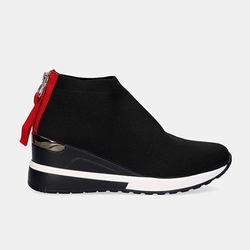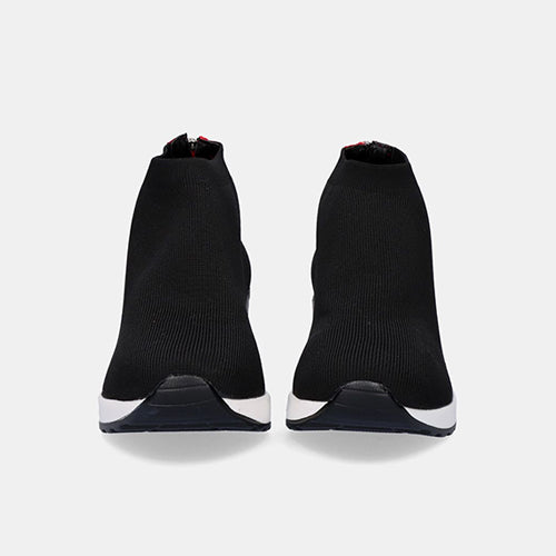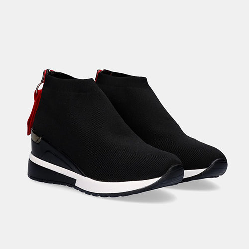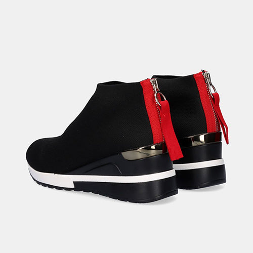 Botín estilo calcetín tobillero de la marca EXE. Fabricado en material textil color negro. Tacón tipo cuña en bicolor blanco y negro. Cierre con cremallera en la parte trasera con detalle de vistoso tirador en color rojo. Pieza metálica en color gris humo en la parte trasera. Suela de goma.