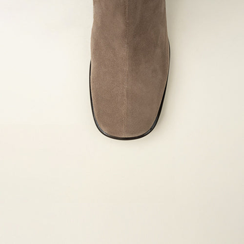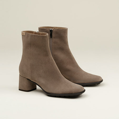 Botín de tacón medio de Gaimo. Fabricado en suave piel de serraje en color taupe. Incorpora una cremallera lateral que facilita el calce sin perder estilo. Su silueta cuidada y minimalista ofrece versatilidad para elevar cualquier look. Un diseño elegante y contemporáneo.