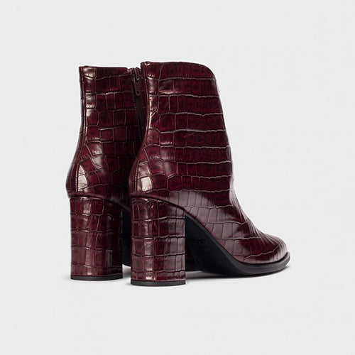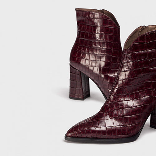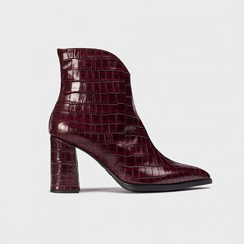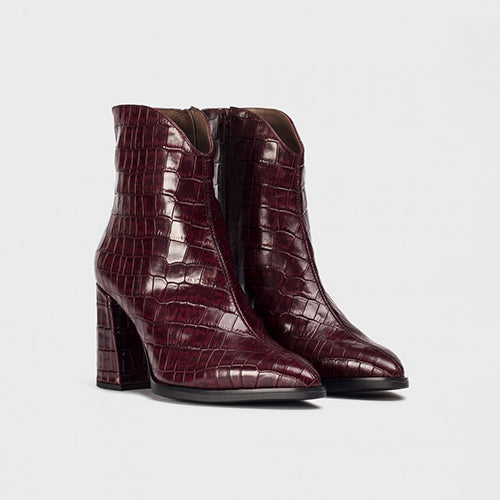 Botín de tacón alto de la marca Wonders. Fabricado en piel coco color burdeos. Cierre mediante cremallera situada en la parte lateral interior del modelo. Tacón forrado al tono. Escote en pico y puntera afilada. Interior de piel. Suela de goma.