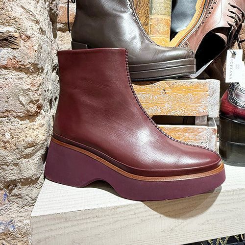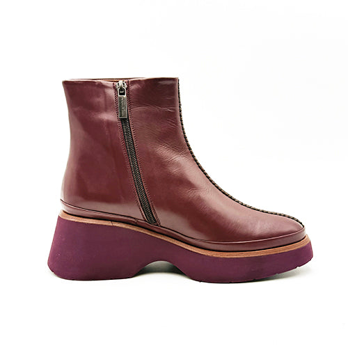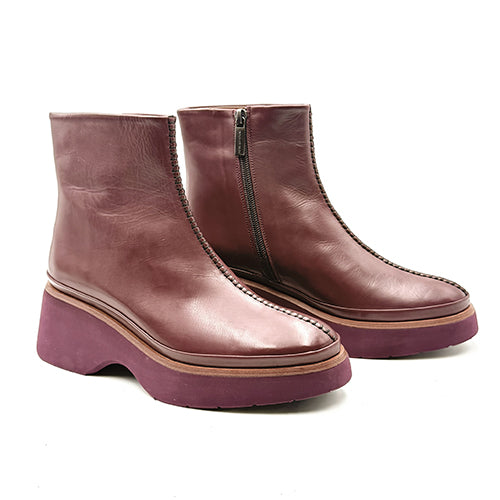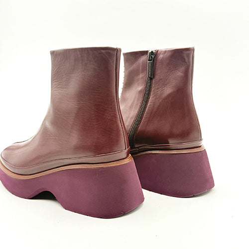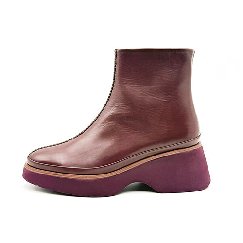 Botín de plataforma de la marca Pons Quintana. Confeccionado a mano en piel velour color burdeos. Detalle de pespunte central sobre el empeine. Cierre mediante cremallera situada en el lateral interior. Vira de piel a tono. Suela extra ligera a contraste con tecnología light weight.