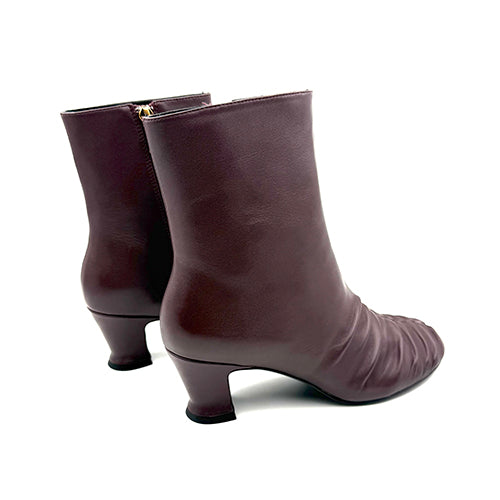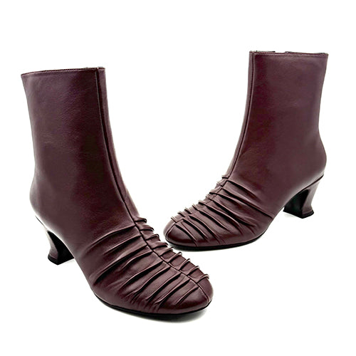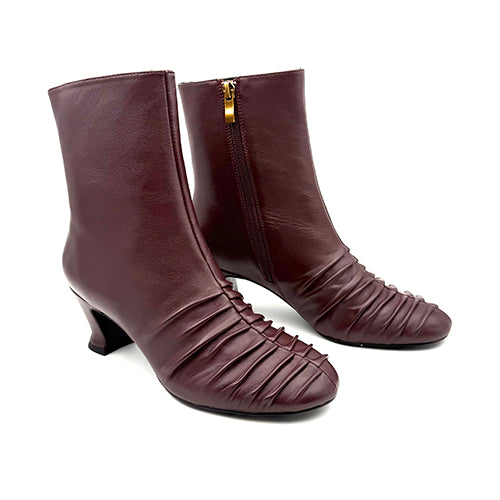Botín de la marca Inés Palliser. Fabricado en piel color burdeos. Modelo de puntera redondeada. Cierre mediante cremallera situada en la parte lateral interior. Tacón ancho de altura media. Original detalle de efecto corrugado en la parte frontal.