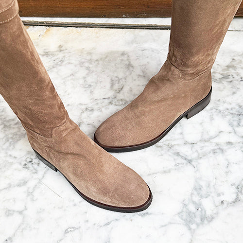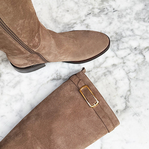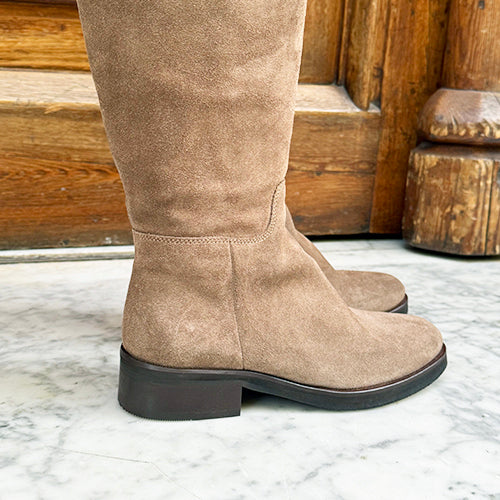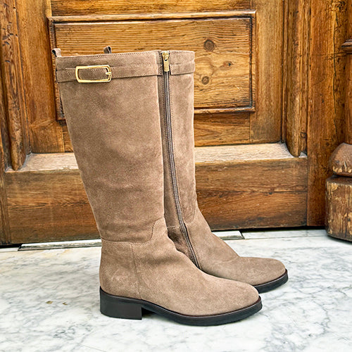 Bota alta de la marca itse. Fabricada en piel nobuk color taupe. Detalle de hebilla decorativa en la parte superior. Cierre mediante cremallera situada en la parte interior del modelo. Tacón bajo. Suela de goma.