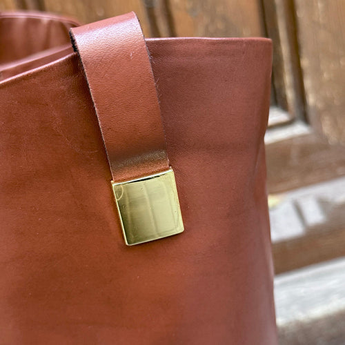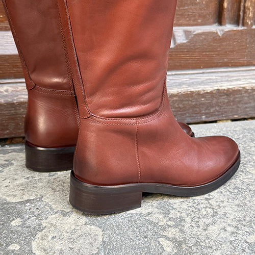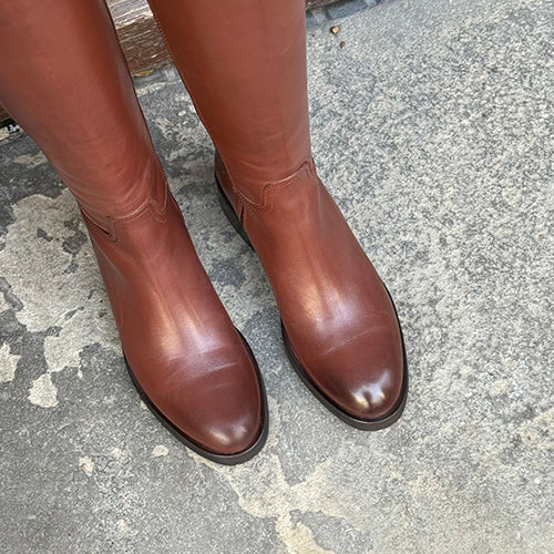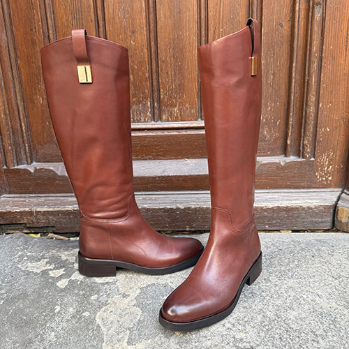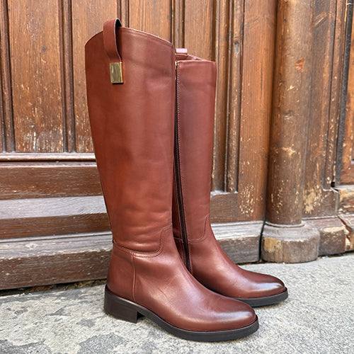 Bota alta de la marca itse. Fabricada en piel color cuero. Detalle de tira decorativa acabada en pieza metálica dorada en la parte superior. Cierre mediante cremallera situada en la parte interior del modelo. Tacón bajo. Suela de goma.