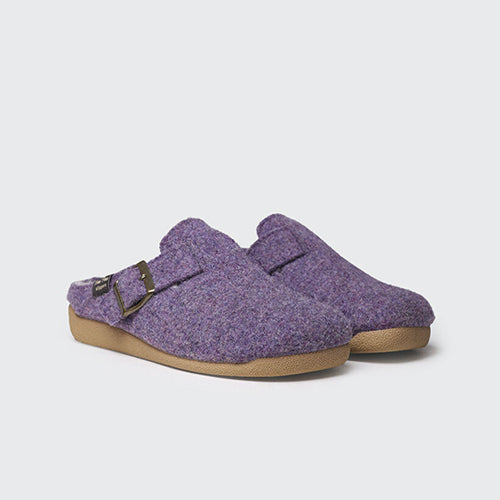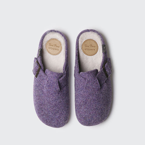 Zapatilla de casa de la marca Toni Pons. Fabricada en fieltro en color lila. Detalle de hebilla ajustable para asegurar una sujeción perfecta al pie. Suela de goma antideslizante. Cuenta con una plantilla interior forrada en suave pelo sintético para asegurar el mayor confort.