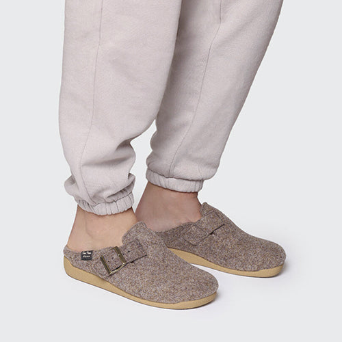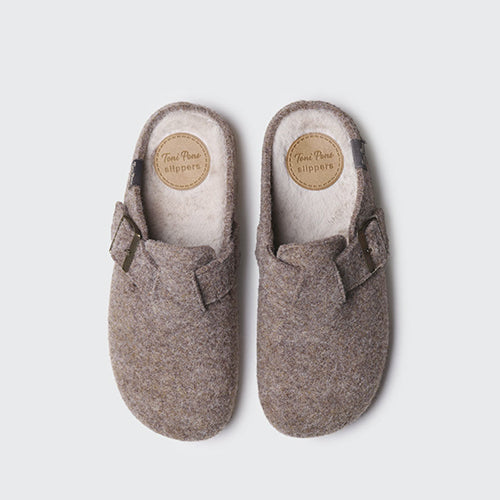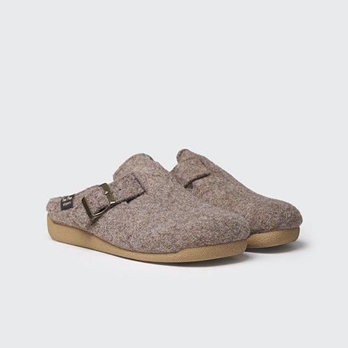 Zapatilla de casa de la marca Toni Pons. Fabricada en fieltro en color taupe. Detalle de hebilla ajustable para asegurar una sujeción perfecta al pie. Suela de goma antideslizante. Cuenta con una plantilla interior forrada en suave pelo sintético para asegurar el mayor confort.