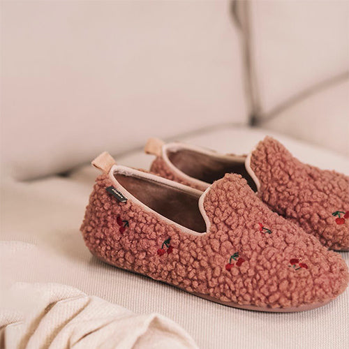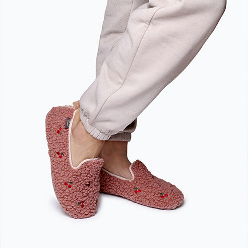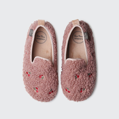 Zapatilla de casa de la marca Toni Pons. Fabricada en borrego color rosa con motivos bordados. La suela es plana y está hecha de goma antideslizante. Cuenta con una plantilla interior de tejido suave para un mayor confort.