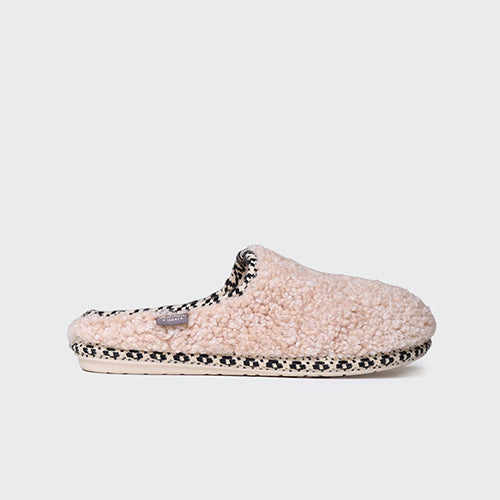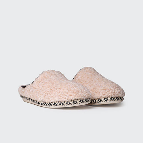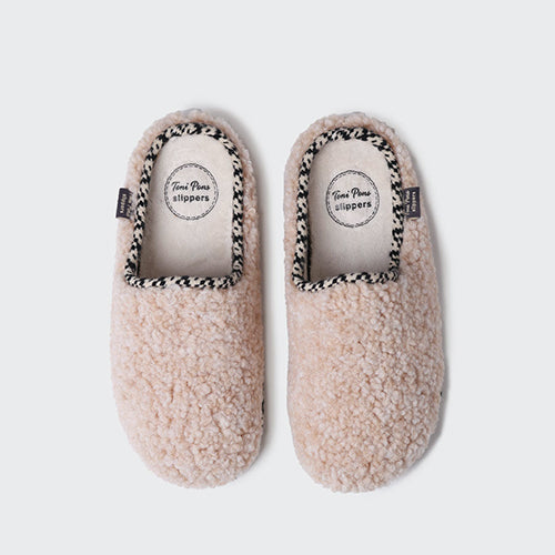 Zapatilla de casa de la marca Toni Pons. Fabricada en borrego color beige, destaca por su calidez y ligereza. Su forma abierta tipo zueco la convierte en un modelo muy ligero que se adapta a todo tipo de pie.