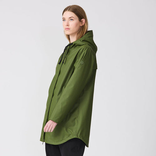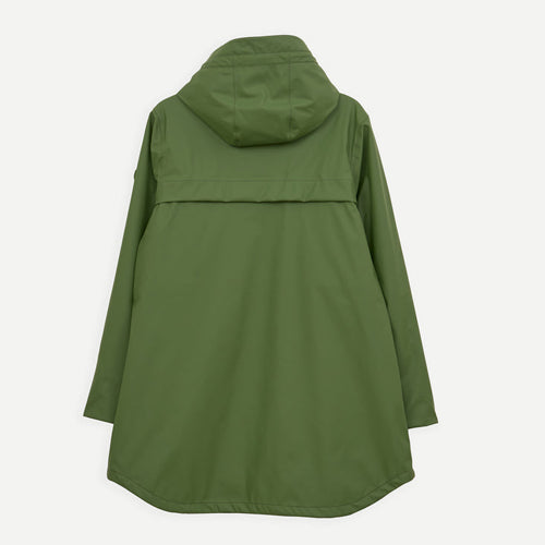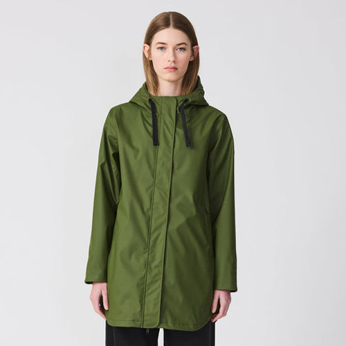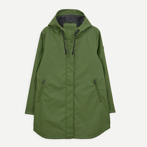 Chaqueta impermeable TANTÄ en color verde. Estilo moderno y funcional que combina la practicidad con un diseño depurado. Con costuras totalmente selladas, está confeccionada con nuestro icónico PU mate 100% impermeable, e incorpora una capa aislante ligera, transpirable y sin plumas. Con un bajo en forma curvada y un interior forro polar desde los hombros hasta la cintura, este modelo contemporáneo y versátil es perfecto para llevar a diario.